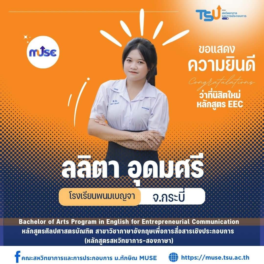 ขอแสดงความยินดีและยินดีต้อนรับ น้องเปีย ลลิตา อุดมศรี ว่าที่นิสิตใหม่ 2568 หลักสูตร EEC