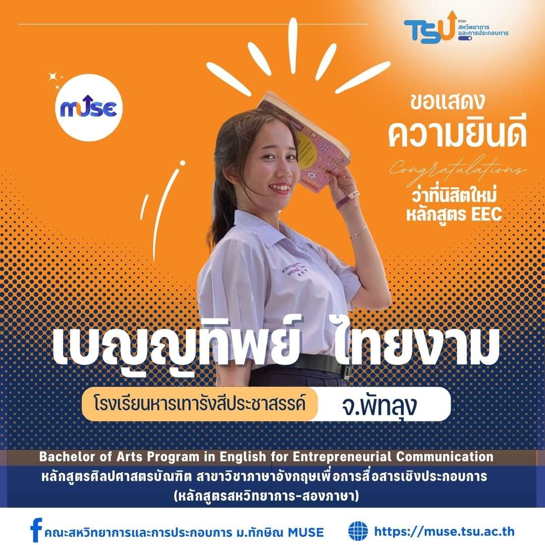 ขอแสดงความยินดีและยินดีต้อนรับ น้องมุก เบญญทิพย์  ไทยงาม ว่าที่นิสิตใหม่ 2568 หลักสูตร EEC