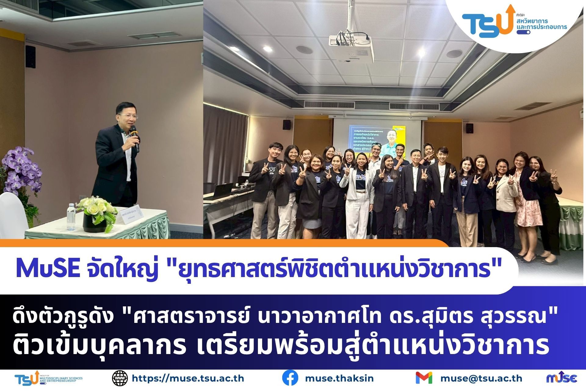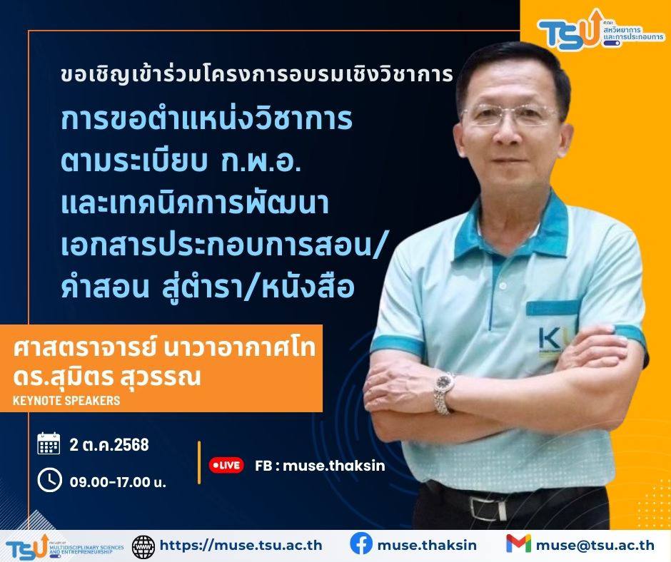 คณะสหวิทยาการและการประกอบการ ขอเชิญเข้าร่วมโครงการอบรมเชิงวิชาการ การขอตำแหน่งวิชาการตามระเบียบ ก.พ.อ. และเทคนิคการพัฒนาเอกสารประกอบการสอน/คำสอน สู่ตำรา/หนังสือ โดย ศาสตราจารย์ นาวาอากาศโท ดร.สุมิตร สุวรรณ