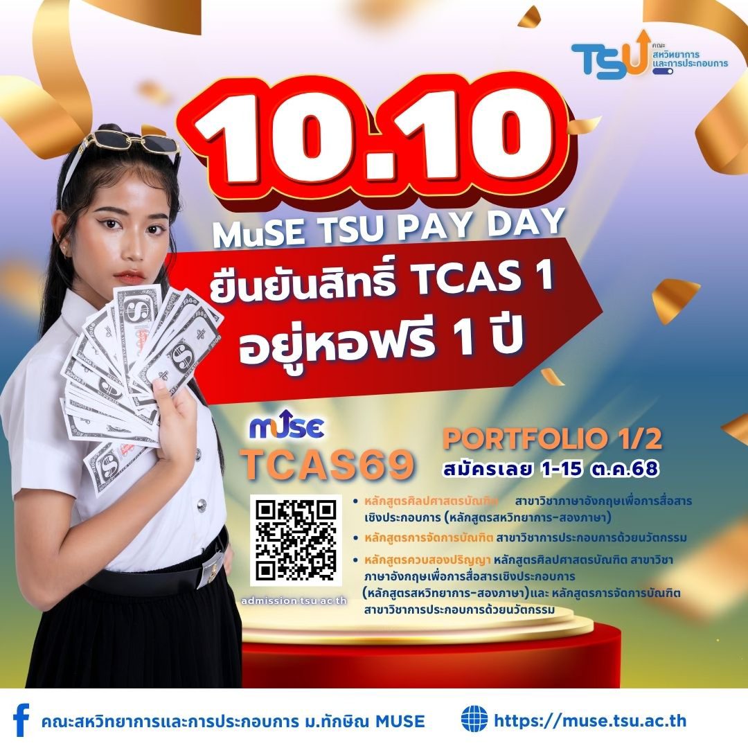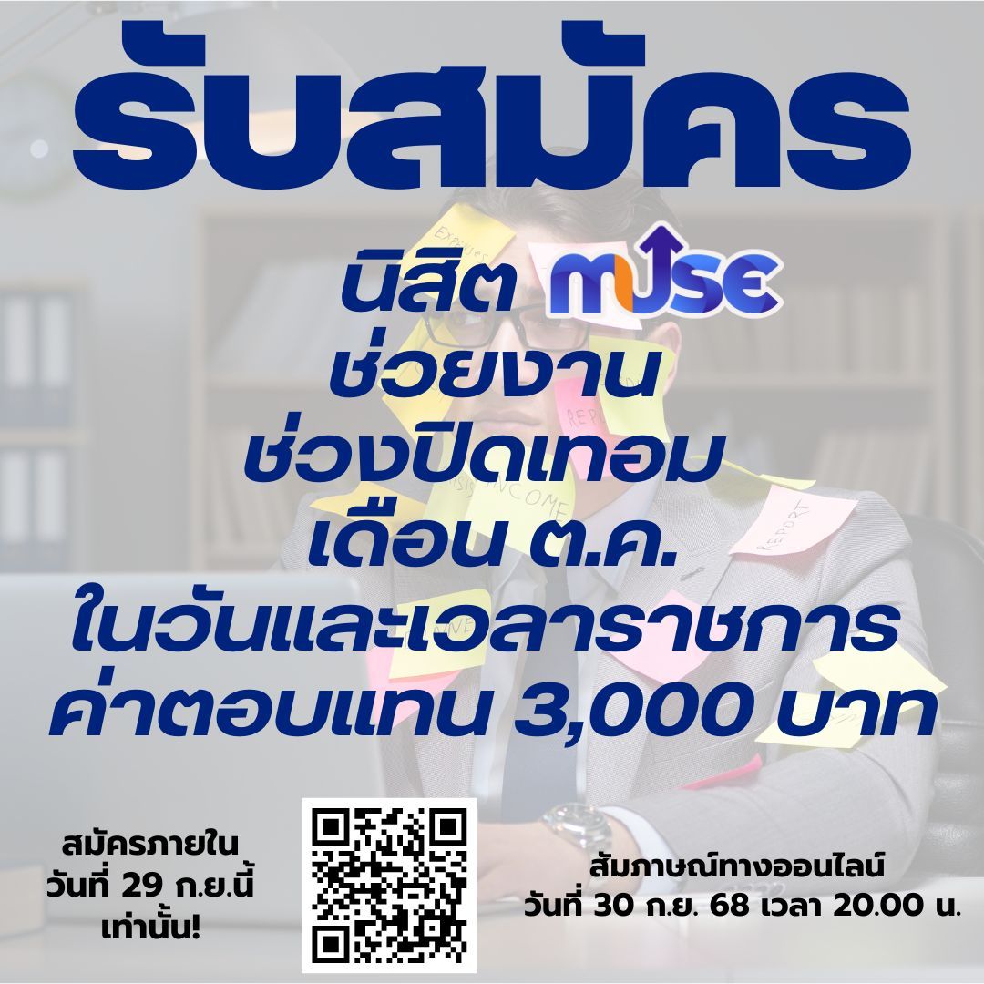 รับสมัคร นิสิต MuSE ช่วยงานช่วงปิดเทอม เดือน ต.ค. ในวันและเวลาราชการ ค่าตอบแทน 3,000 บาท สมัครภายในวันที่ 29 ก.ย. นี้เท่านั้น! สัมภาษณ์ทางออนไลน์ วันที่ 30 ก.ย. 68 เวลา 20.00 น.